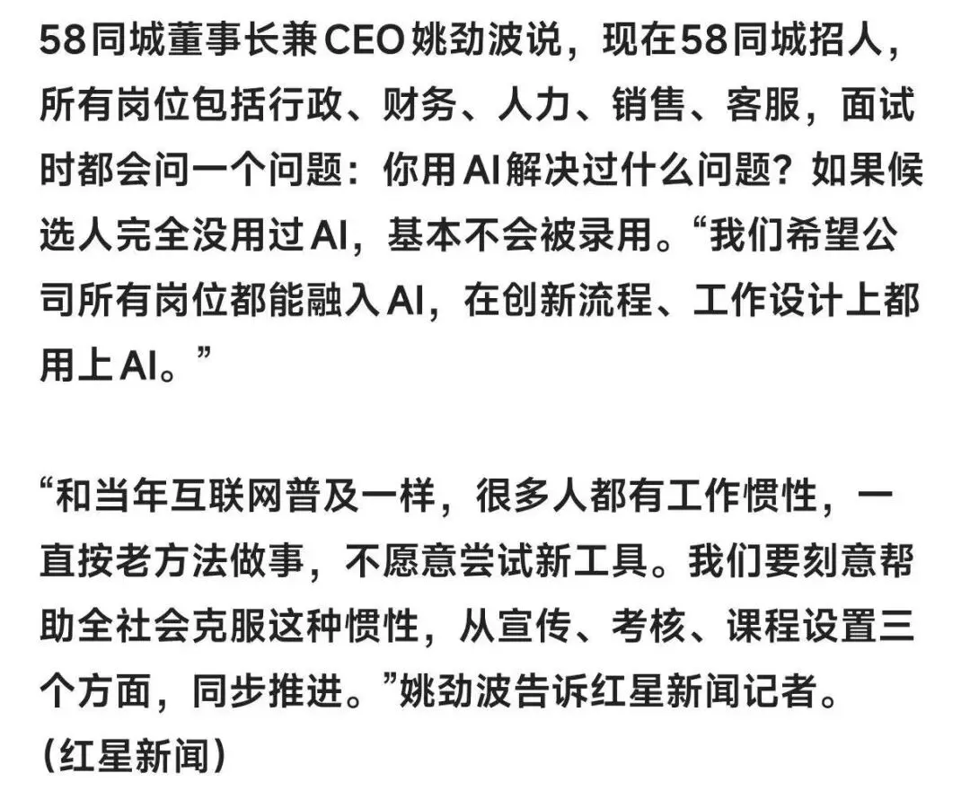 以前拼Office,现在拼AI:职场正在淘汰不会用AI的人近期58同城董事长姚劲波的一番言论在职场圈产生热议他说,现在面试时都会问一个问题:你用AI解决过什么问题?如果候选人完全没用过AI,基本上不会录用十年前,面试官打量求职者的第一句话,总绕不开“Word和Excel熟吗?”——能熟练敲出规范文档、用函数做表、用透视表分析数据,就是职场硬通货。那时,掌握这两款工具,意味着你能高效完成文档处理、数据统计等基础工作,是胜任多数岗位的“敲门砖”。而站在2026年的职场路口,我们突然发现,招聘JD里的关键词早已变了。“熟练Office”的优先级不断后置,“掌握AI工具”“能与AI协同工作”成了越来越多岗位的硬性要求。猎聘数据显示,2026年开工首周,企业招聘中明确要求会使用AI工具的岗位同比增长215.61%,相关职位平均年薪达27.34万元,显著高于未要求AI能力的职位。这不是偶然的行业波动,而是职场底层逻辑的重构。从“操作工具”到“驾驭智能”:AI改写办公全流程过去,我们靠Word排版、Excel函数完成日常工作,核心是“手动操作”——敲字、调格式、输公式,每一步都要亲力亲为,耗时且易出错。写一份周报,光整理数据、调整格式就要2小时;做一份销售分析,用透视表汇总数据至少30分钟;处理会议纪要,逐字记录、提炼要点更是耗时耗力。现在,AI重构了整个办公流程,核心是“人机协同”。文档处理上,AI能一键生成报告、优化文案、自动排版。输入“帮我写一份2026年Q1产品复盘报告,包含DAU、留存率、收入数据,分析增长放缓原因并提3个关键举措”,15分钟就能拿到结构完整、逻辑清晰的初稿,效率提升8倍;数据处理上,AI替代了Excel的重复操作。用ChatExcel等工具,对数据清洗、公式生成、图表创建全程仅需3-5分钟,原本30分钟的透视表工作,3分钟就能完成,效率提升10倍;会议协作上,AI可实时转写文字、区分发言人、自动提取待办事项,告别手忙脚乱的记录,让会议效率翻倍。更关键的是,AI打破了“技术门槛”的限制。以前,非技术岗位很难接触到复杂的数据分析工具,现在用自然语言就能实现需求——“按部门统计Q1销售额增长率”“生成年度业绩可视化图表”,AI自动完成计算与呈现,让普通职场人也能轻松驾驭数据。职场竞争分水岭:会用AI,是生存门槛;不会用,是淘汰风险职场从来都是“适者生存”,AI的普及,正在加速拉开从业者的差距。一方面,AI技能从“加分项”变成了“必备项”。智联招聘调研显示,78%的岗位将AI能力列为硬性要求,不会AI,连简历筛选都可能过不了。行政助理、数据录入员等重复性强的岗位,月薪较2020年下降超25%,而掌握AI技能的员工,平均薪资比同岗位不会AI的高出23%,且差距还在持续扩大。埃森哲、毕马威等头部企业已将AI工具使用情况与晋升、绩效挂钩,未来不会用AI,可能连晋升通道都没有。另一方面,AI正在重塑岗位能力要求。技术岗不再只看代码编写能力,更看重AI生成代码的质量把控、系统集成能力;运营岗需要用AI分析用户反馈、生成营销内容;设计岗要会用AI生成素材、优化视觉;就连客服岗,AI也能自主处理70%的重复咨询,让人工从“被动解答”升级为“主动解决”。我们身边早已出现这样的对比:同事小王还在熬夜手动做表格、调格式,下班时间被无限拉长;同事小李用AI辅助,半天完成一周的工作,有时间学习新技能、陪伴家人。一年后,小王还在基础岗位挣扎,小李却因高效的工作能力和AI协同能力,获得了晋升机会。不是AI替代人,是会用AI的人替代不会用的人很多人担心“AI会取代人类工作”,但本质上,AI替代的不是岗位,而是“低价值的重复劳动”。它解放了我们的双手,让我们从繁琐的事务中抽离,聚焦于更有价值的思考、创意与决策——这才是人类不可替代的核心竞争力。亚马逊用AI接管重复性工作,6000人就能胜任过去1万人的工作,经营利润率大幅提升;微软通过Copilot优化办公流程,减少基础运营岗,将资源投入核心业务创新。这些巨头的转型告诉我们:未来职场,不是“人与AI的博弈”,而是“会用AI的人与不会用AI的人的竞争”。那么,普通人该如何跟上时代?首先,放下焦虑,从基础工具入手。WPS AI、微软365 Copilot、ChatGPT、ChatExcel等都是入门利器,先尝试用AI写一份文档、分析一组数据、生成一份PPT,感受效率提升,建立使用信心。其次,掌握“人机协同”的核心逻辑。不是完全依赖AI,而是学会给AI精准提需求——明确角色、背景、格式与要求,让AI生成内容后,再结合自身经验优化打磨,提升结果质量。最后,持续学习,培养复合能力。AI是工具,更是赋能者,要将AI与自身专业结合,比如内容运营用AI提升创作效率,财务用AI优化数据分析,成为“π型人才”——既有扎实的专业功底,又有AI协同能力,成为职场稀缺资源。十年前,我们为了熟练Word Excel熬夜练技能;十年后,我们为了掌握AI工具主动学习。职场的门槛一直在变,但不变的是“持续进化”的生存法则。以前,不会Word Excel,可能连面试机会都没有;现在,不会AI工具,可能连工作机会都留不住。与其焦虑时代变化,不如主动拥抱AI,让它成为职场进阶的加速器。毕竟,在这个快速迭代的时代,能与AI并肩前行的人,才是最终的赢家。