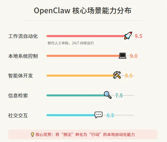OpenClaw能干什么:你的本地AI“数字管家”它不是又一个聊天机器人,而是一个能真正在你的电脑上“干活”的智能体。想象一下,一个全天候待命的数字助手,能通过微信、飞书等常用通讯软件接收你的指令,然后在你的Mac、Windows或Linux电脑上自动执行任务——从整理文件到控制智能家居,从编写代码到管理日程,它正在重新定义“个人AI”的边界。核心定位:本地优先的AI代理网关OpenClaw的核心是一个运行在你自有设备上的TypeScript命令行应用。它充当一个“网关”,将大型语言模型(如deepseek、豆包等)的能力与你电脑的本地功能(文件系统、浏览器、Shell命令)以及外部服务(如通讯软件)连接起来。其设计哲学强调“主权个人AI”,将智能(模型)与执行体(本地代理)分离,确保你的数据和隐私完全可控。部署方式核心语言许可证本地部署 / 云端托管TypeScript开源免费它能为你做什么?OpenClaw的价值在于将AI的“思考”能力转化为具体的“行动”。你可以通过熟悉的聊天软件(如微信、飞书、Slack、Discord,甚至iMessage)向它发送文字或语音指令,它会在你指定的设备上执行任务,并将结果反馈回来。💻 开发与工作流自动化对于开发者而言,OpenClaw是一个强大的自动化伙伴。它可以集成GitHub,管理代码库,设置定时任务(cron jobs),或通过Webhook触发自动化流程,让你在休息时项目也能持续运行。有用户分享,他让OpenClaw在夜间运行编码代理,醒来时工作已完成。📅 个人生产力管家它能统一管理你的多个生产力工具。只需在聊天窗口中说一句,OpenClaw就能帮你在Apple Notes中添加备忘、在Things 3中创建待办事项、在Notion中更新页面,或在Trello中移动卡片 。Steve Caldwell甚至用它构建了一个每周膳食计划系统,为家庭每周节省一小时。🌐 网页自动化与信息处理OpenClaw内置基于Playwright的浏览器工具。这意味着你可以让它自动填写网页表单、抓取特定数据、导航网站。其“语义快照”技术不是截取图片,而是将网页元素转化为文本化的无障碍树(ARIA)表示,极大减少了数据处理量和成本。✍️通讯与内容创作草拟并安排推文发布到Twitter/X和Bluesky,或通过Gmail管理邮件工作流。结合Spotify、Sonos或Replicate等集成,它还能协助生成图像、搜索GIF或创建音频内容。🛒生活事务处理社区用户展示了其多样化的应用:AJ Stuyvenberg用它来协商购车,André Foeken用它协调超市订单,Andy Griffiths甚至在喝咖啡的功夫就让它构建了一个功能完整的Laravel应用。核心工作原理与技术架构OpenClaw的魔力源于其精巧的架构设计,它将复杂的AI代理任务分解为可管理、可序列化的步骤。🔧 核心工作流程1. 指令接收:你的消息通过“通道适配器”(Channel Adapter)进入系统,进行标准化处理。2. 任务协调:“网关服务器”(Gateway Server)作为中枢,将消息路由到对应的会话,并管理一个“任务通道”队列,确保操作默认串行执行,避免竞态条件。3. 智能体执行:“智能体运行器”(Agent Runner)动态构建系统提示词,结合可用工具、技能和记忆,调用大语言模型API。4. 行动与循环:如果模型返回工具调用指令(如运行Shell命令),OpenClaw会在本地执行,并将结果反馈回对话。此“智能体循环”会持续进行,直到任务完成或达到循环上限(默认约20次)。5. 结果反馈与记忆:最终结果通过原渠道返回给你,同时整个会话会以JSON Lines格式持久化存储,形成基于对话的记忆。🧠 记忆与技能系统OpenClaw拥有两套记忆系统:一是基于会话的JSONL记录,二是存储为Markdown文件的长期记忆。它采用向量检索与关键词匹配相结合的混合检索方式,确保既能语义匹配也能精确查找。其能力通过“技能”(Skills)扩展。OpenClaw本身并非预装所有功能,而是通过Python、Node.js或Shell脚本定义新技能。更强大的是,在高级配置下,AI模型可以自行编写代码创建新技能并保存,实现某种程度的“自进化”。社区已贡献了100多个预配置的AgentSkills。安全与部署考量赋予AI本地执行权限必然伴随风险。OpenClaw借鉴了Claude Code的设计思路,采用了命令白名单机制 。用户可以对命令设置“单次允许”、“始终允许”或“拒绝”的审批策略。像jq、grep这类相对安全的命令已预批准,而危险的Shell语法(如rm -rf /)会被默认拦截。代理默认在沙箱Docker容器中运行,但也支持在本地宿主机或远程设备上执行。部署需要Node.js 22或更高版本环境。对于希望快速上手的用户,阿里云、腾讯云、火山云等云服务商提供了安全加固的一键部署镜像。快速发展的生态OpenClaw的爆发催生了一个蓬勃的生态系统。Base中文台整理的生态图显示,其应用已覆盖社交、恋爱、工作、游戏、预测市场、代币经济等十大场景。从基础设施(如Bankr、XMTP)到社交媒体应用(如moltbook.bot),再到游戏虚拟世界(如molt.chess),一个围绕本地优先AI智能体的“数字社会”正在形成。总结:简而言之,OpenClaw将AI从“对话伙伴”升级为“行动伙伴”。它正在验证一个未来:AI不仅是信息的处理器,更是任务的执行者,且这个执行者完全听命于你,运行在你的地盘。它的火爆,或许正预示着个人计算范式的一次重要转向。