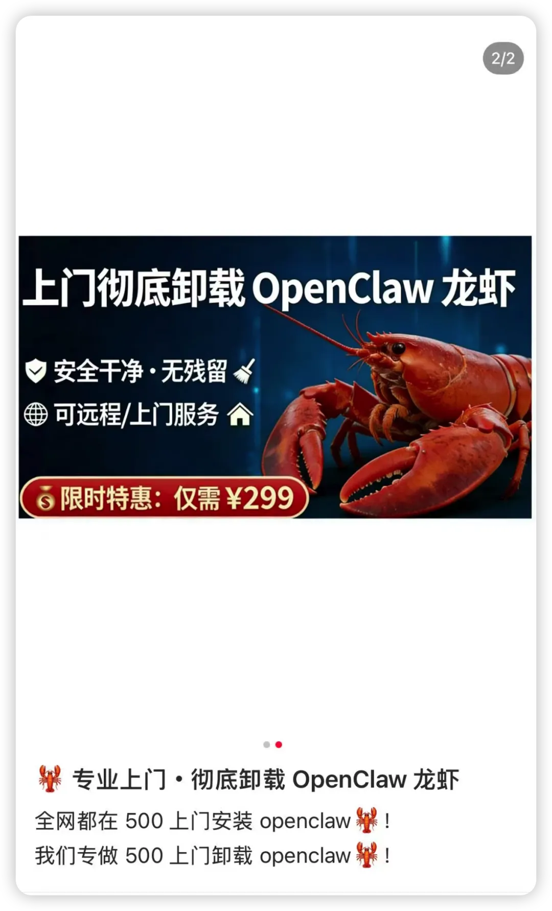 一开始,某些平台上充斥着“上门安装小龙虾”“代搭环境”“帮你接模型”的服务。