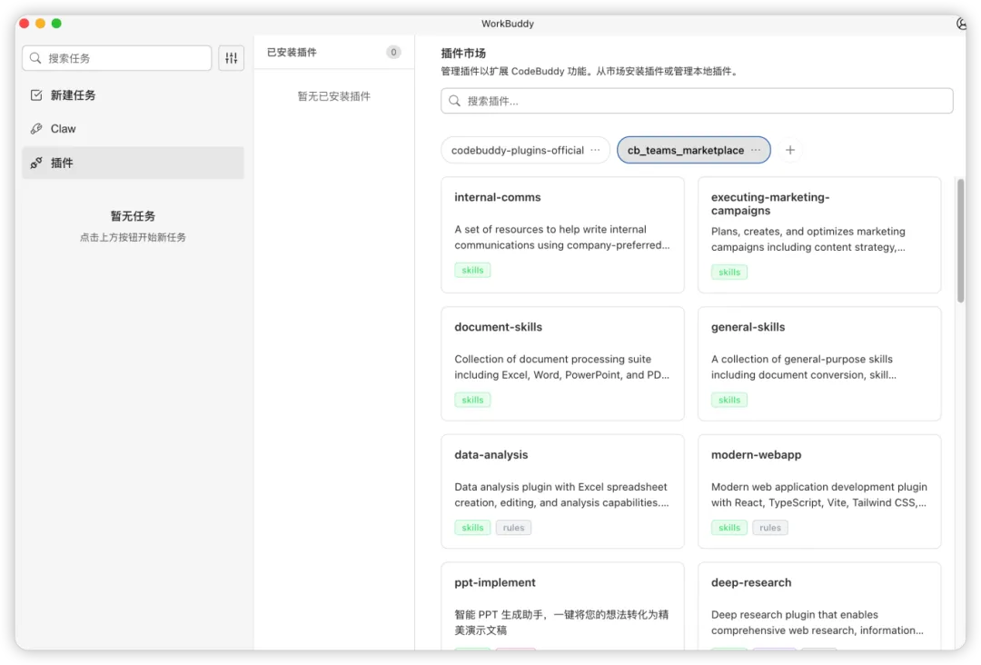 换句话说,它不是只会“答”,而是更像一个可以不断加工具、加能力边界的底座。自带的 skills 可以直接拿来用,插件也可以继续扩展。这样一来,WorkBuddy 的上限就不只取决于一个默认功能列表,而是取决于它后面能接进去多少真实工具和流程。