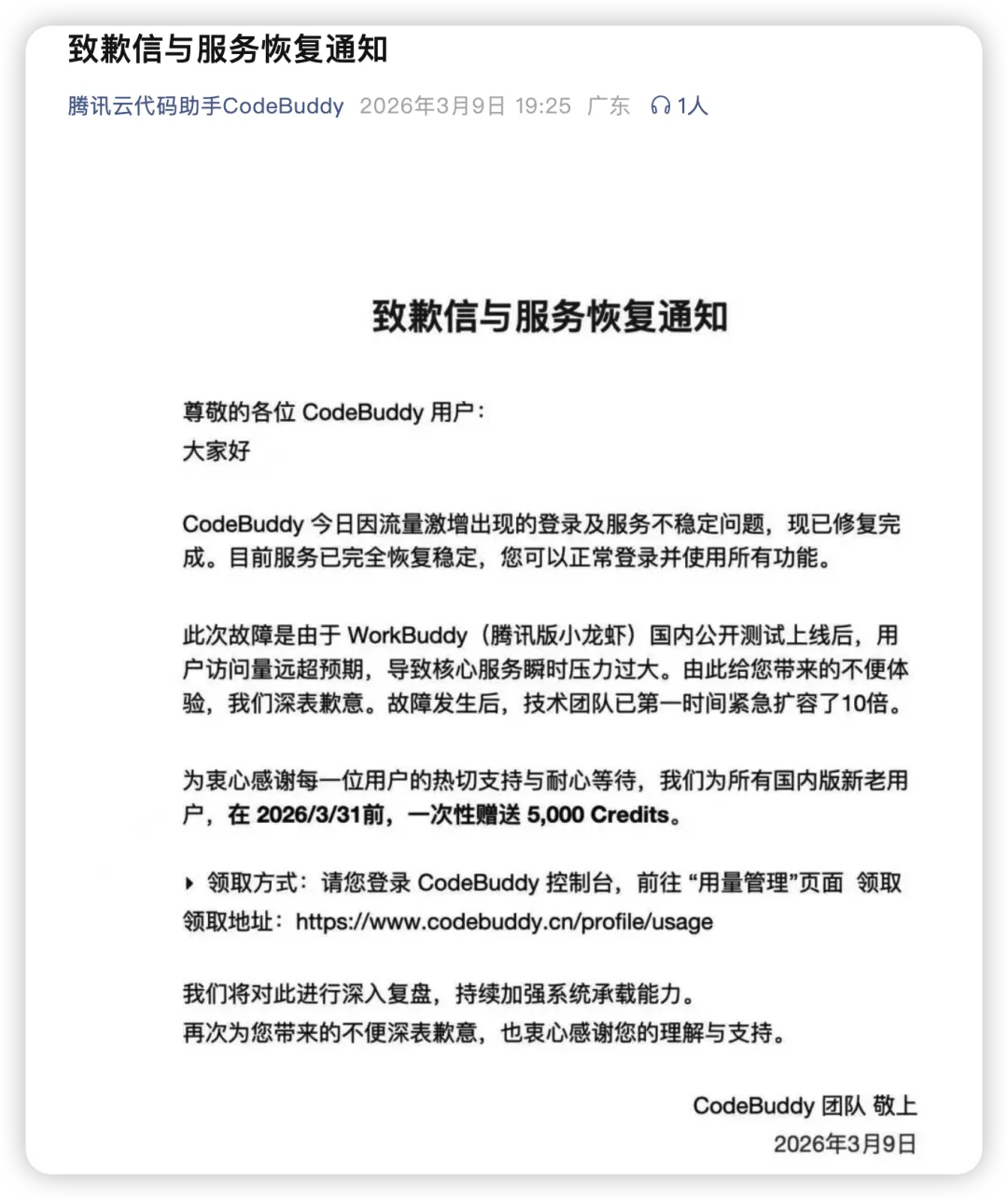 根据公开信息,腾讯云代码助手团队曾在 3 月 9 日发布致歉说明,提到因为 WorkBuddy 国内公开测试上线后访问量远超预期,导致核心服务瞬时压力过大,一度出现登录和服务不稳定的问题,随后进行了紧急扩容。