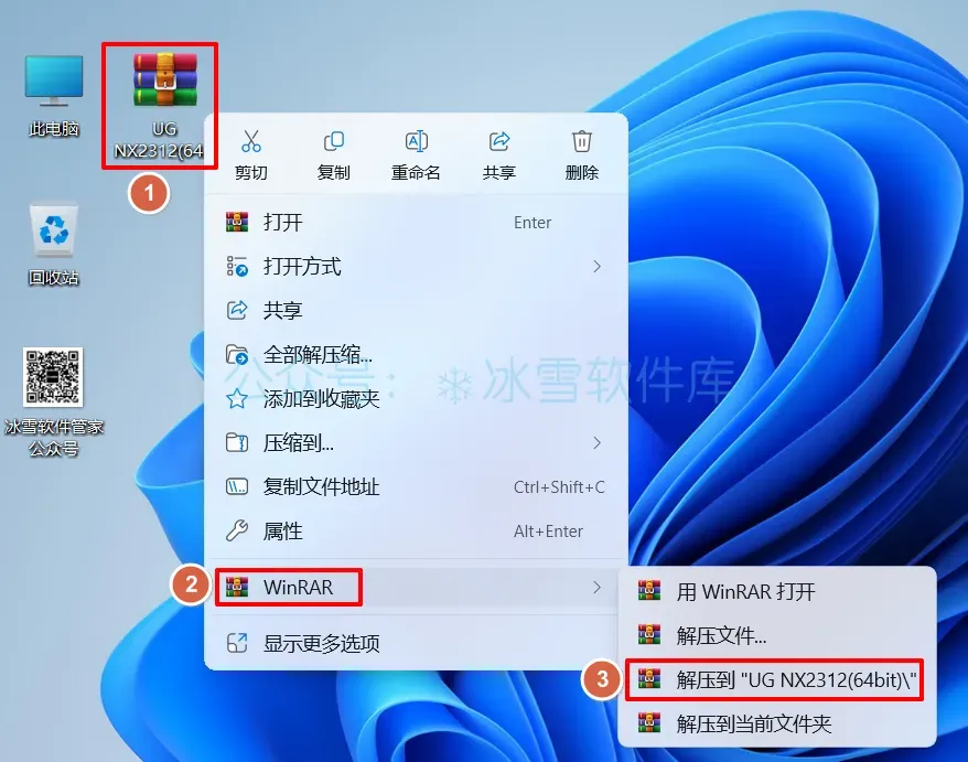 1.解压安装包:①鼠标右击【UG NX2312(64bit)】压缩包②选择电脑上的解压软件(如:WinRAR压缩)③点击【解压到 UG NX2312(64bit)】。