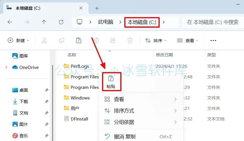4.打开电脑C盘,鼠标右击空白处选择【粘贴】。