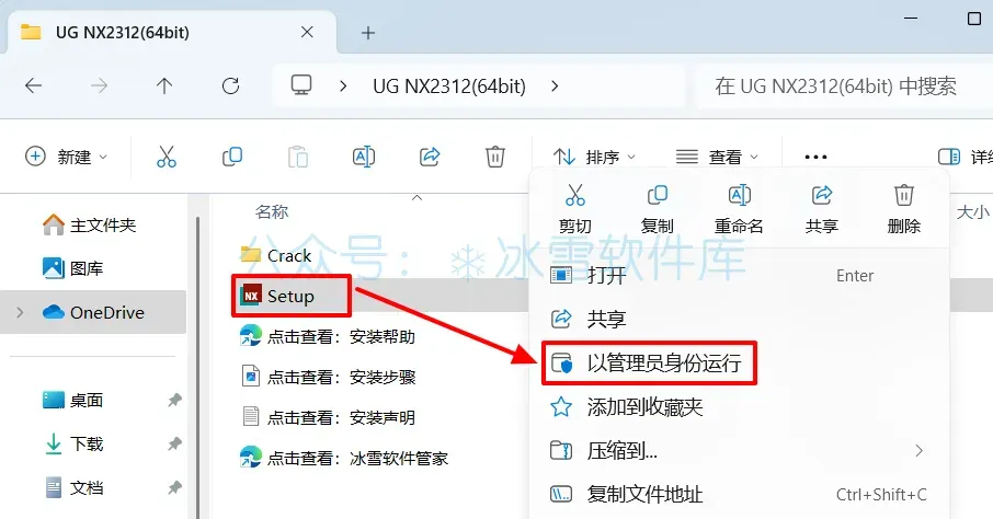6.回到打开的【UG NX2312(64bit)】安装包文件夹,鼠标右击【Setup】选择【以管理员身份运行】。
