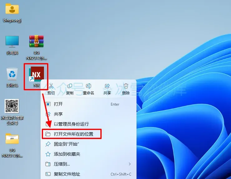 22.鼠标右击桌面的【NX】图标选择【打开文件所在的位置】。