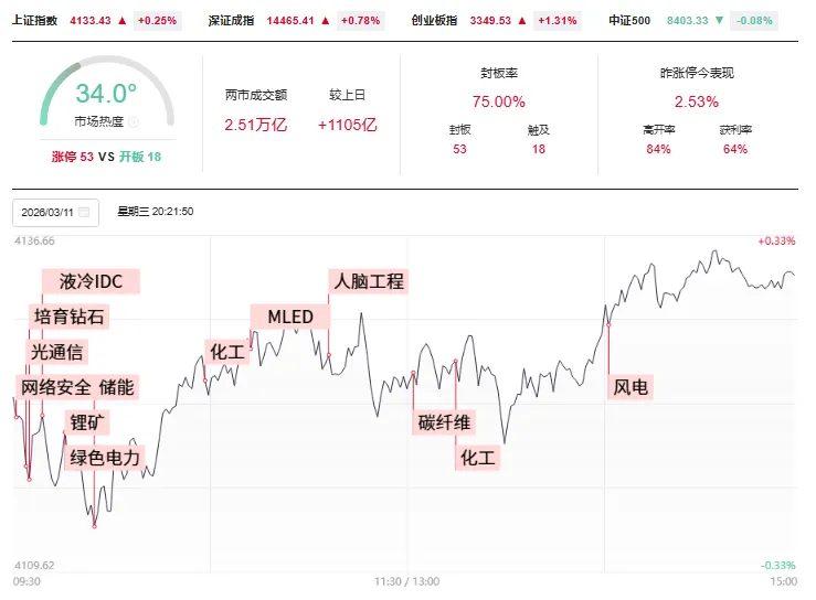 三大指数集体收涨,创业板指冲高回落,此前一度涨超2%,黄白线明显分化。沪深两市成交额2.51万亿,较上一个交易日放量1105亿。