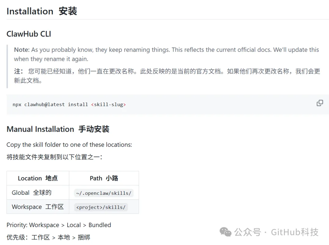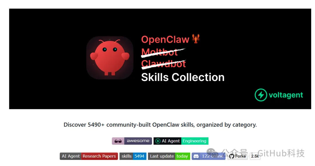 也正是在 Clawdbot 爆火之初,GitHub 上就有开发者迅速整理了一套 Skills 技能合集,并持续迭代、同步官方更名。