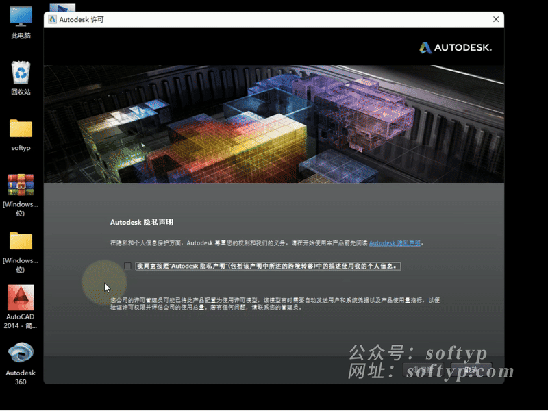 点选【我已阅读Autodesk隐私声明……】➡点击【我同意】(忽略跳出的脚本错误即可)