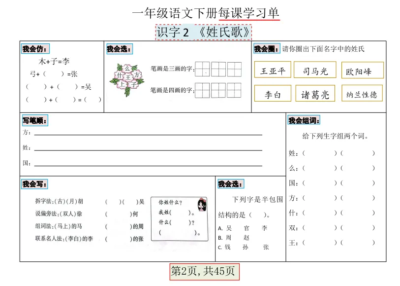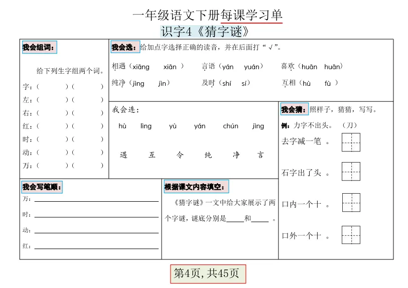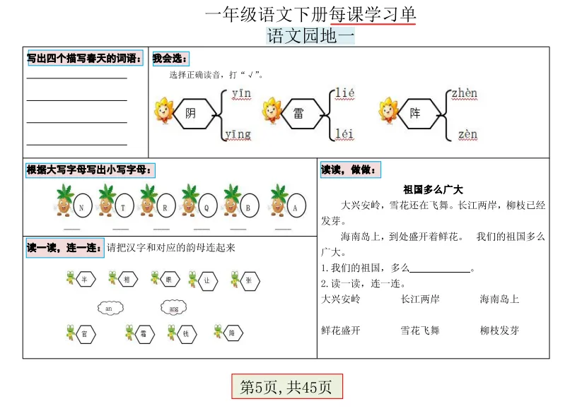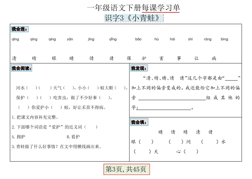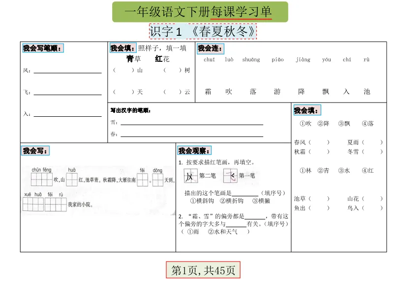 一年级下语文每课学习单45页PDF①:点一点右下角的“赞”和“在看”,留言区回复数字“02”,感谢