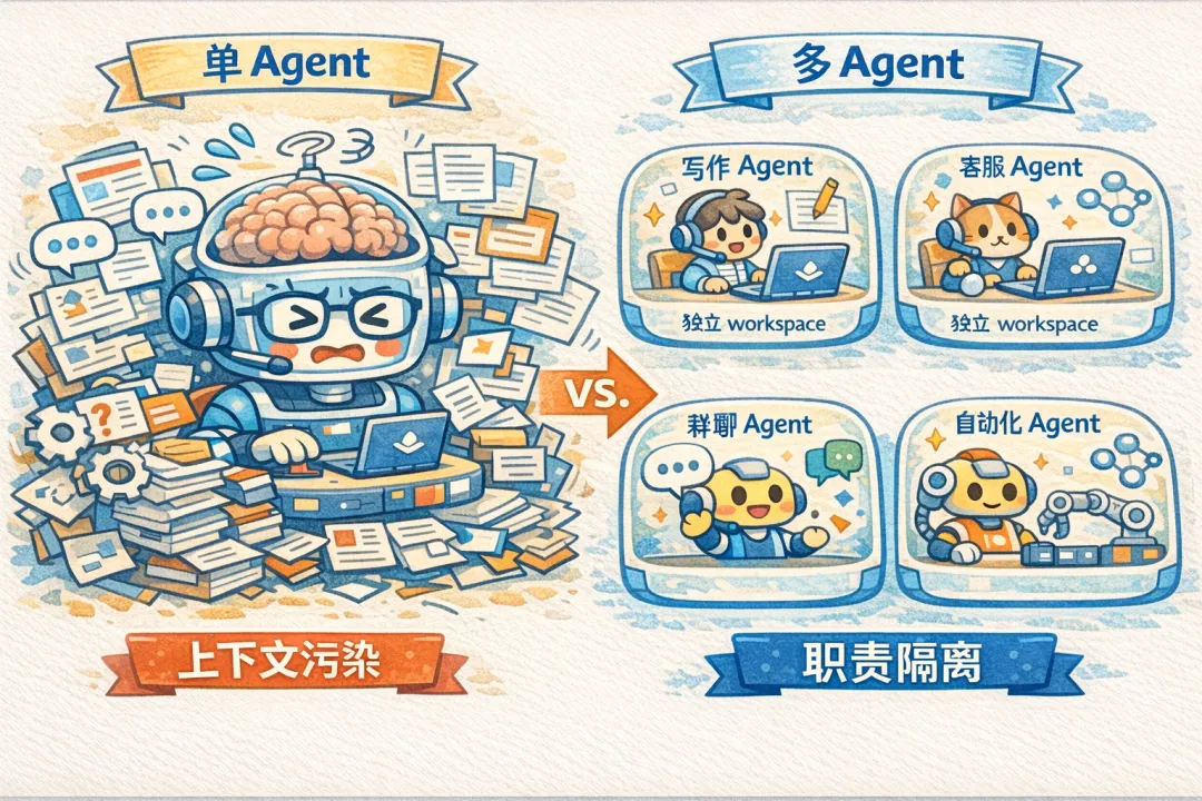 刚把 OpenClaw 跑起来时,喜欢把所有事都塞给一个 Agent:写作、客服、群聊、自动化、资料整理,全都往里堆。