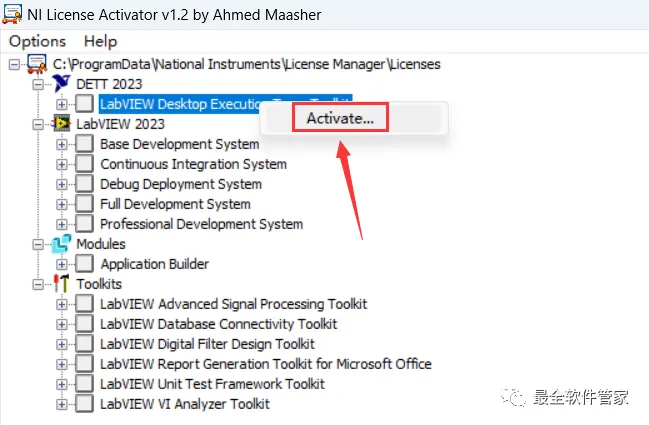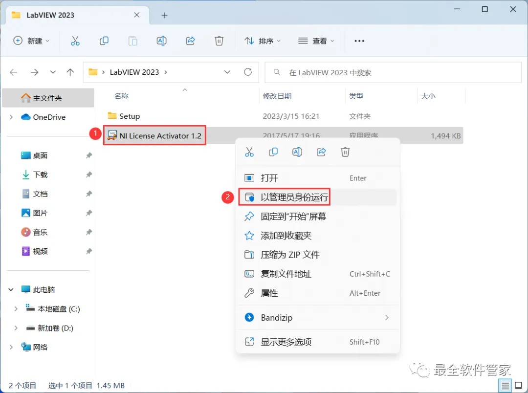15、回到LabVIEW 2023文件夹,找到【NI Lincese Activator 1.2】应用程序,右键选择【以管理员身份运行】它