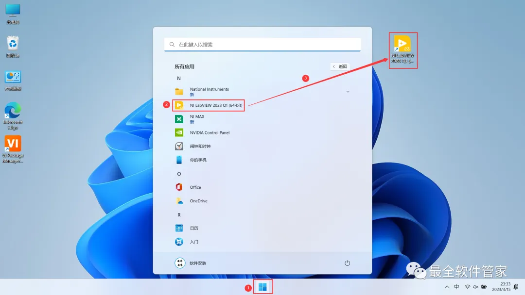 18、回到桌面,点击任务栏的【开始菜单】,在【所有应用】中找到【NI LabVIEW 2023 Q1软件图标】,将软件图标拖到桌面上,完成软件桌面快捷方式的创建