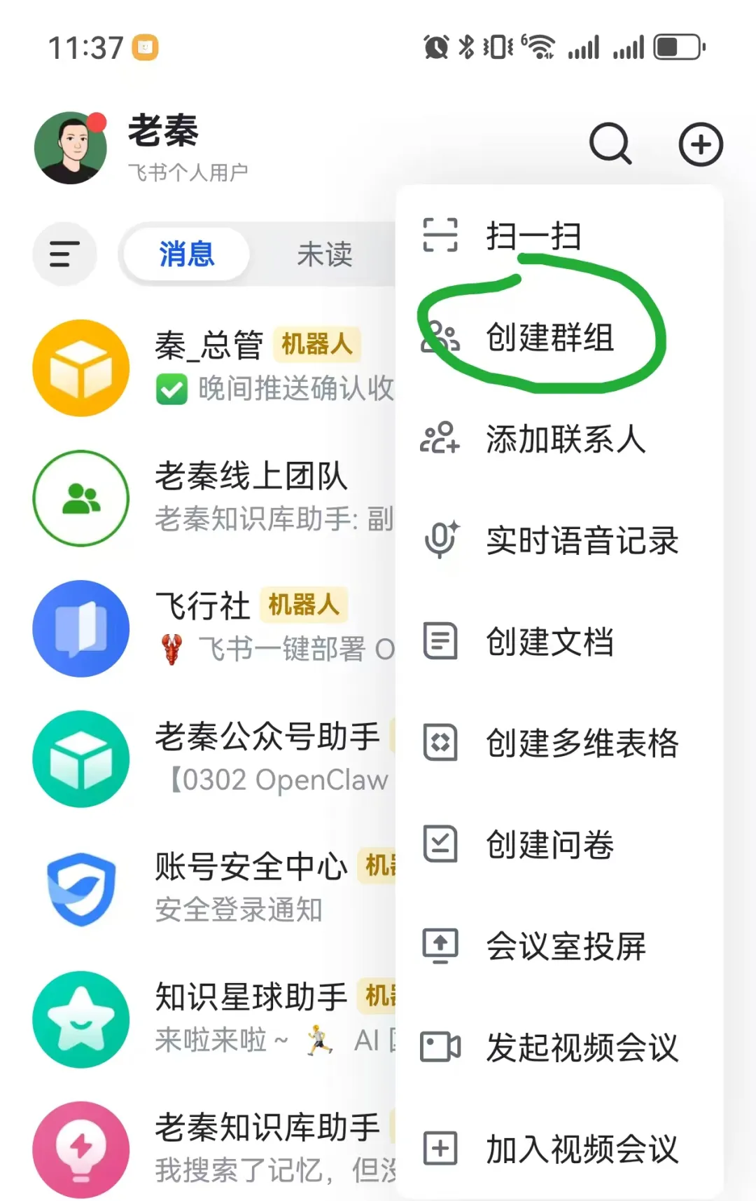 飞书 → 消息 → 点击右上角 「+」