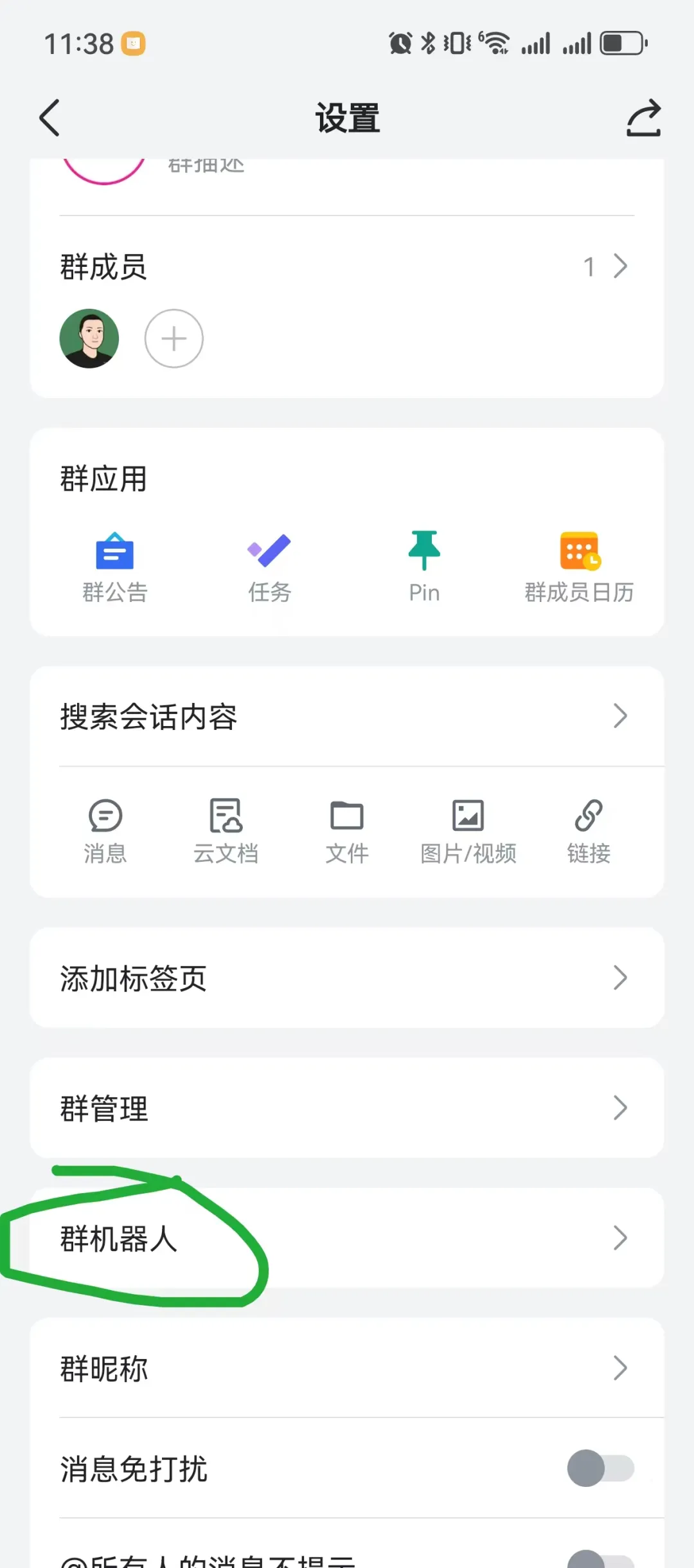 点击「群机器人」,邀请已创建好的群机器人进群。