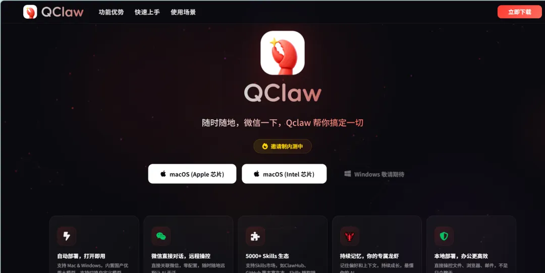 QClaw:https://claw.guanjia.qq.com(目前在内测中,官方内测申请问卷https://wj.qq.com/s2/25871229/abe7/还有听说内测名额也可在「观猹」上面抢:https://watcha.cn)(悄悄的问一句:小伙伴们有抢到内测名额的吗?)