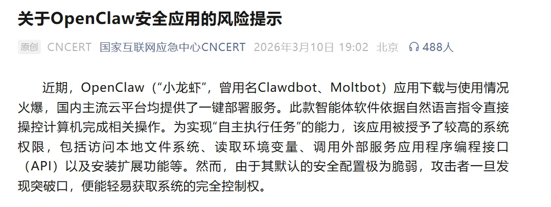 近期,工信部、国家互联网应急中心连续发布官方预警,直指 OpenClaw存在高权限、高风险、默认配置脆弱等问题,全球超13.5万实例暴露公网,极易被黑客控制。