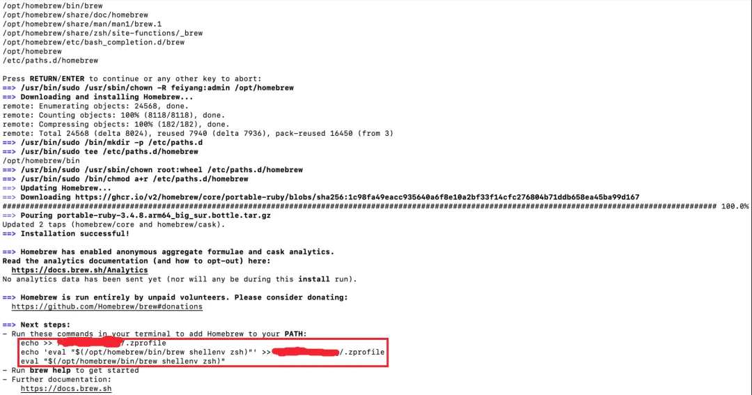Homebrew 安装成功后,根据提示依次执行以下 3 条命令