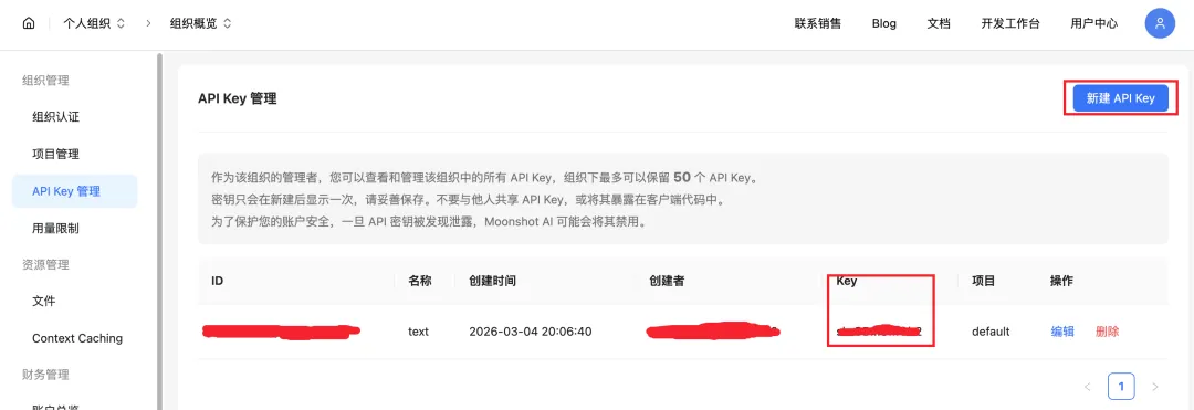 登录kimi的管理后台 https://platform.moonshot.cn/console/api-keys 新建并复制API Key