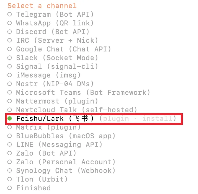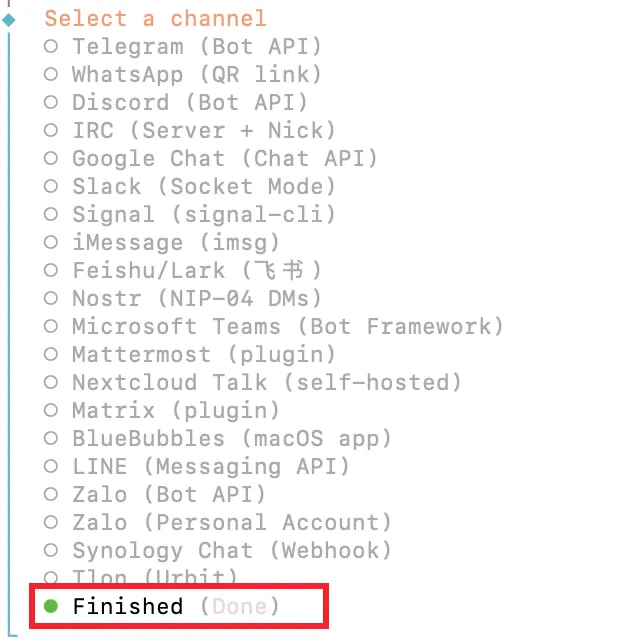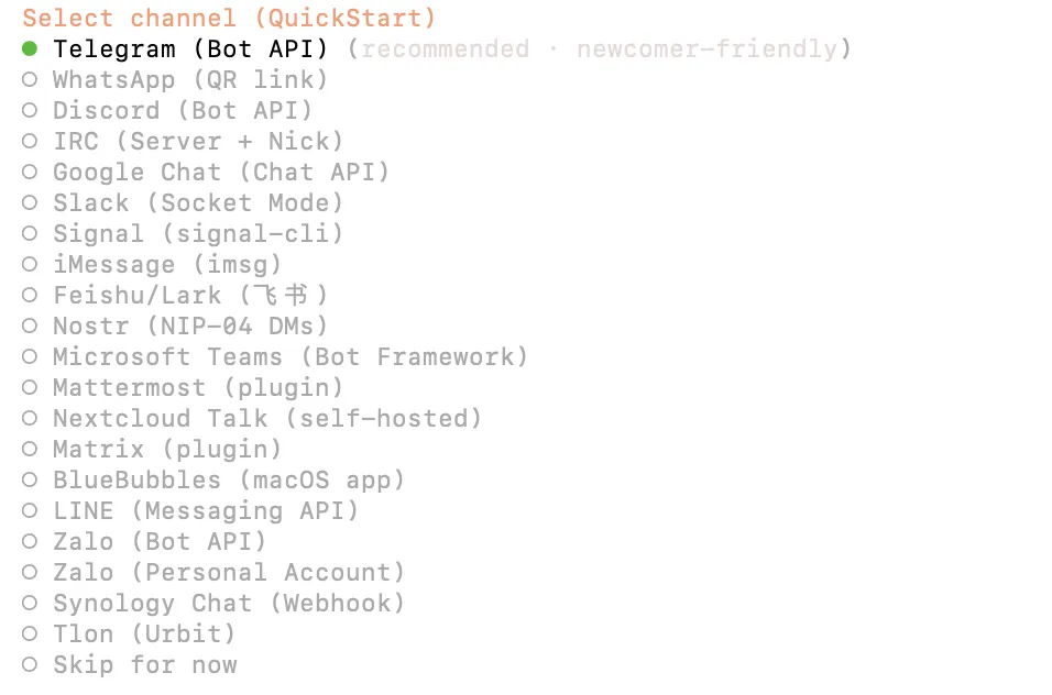 这一步是配置第三方客户端/APP与OpenClaw建立连接,这里先跳过,等飞书配置完之后,再进行openclaw再配置,选择"Skip for now"