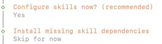 下一步是选择是否安装skill,选yes,查看skill列表,这里看过skill列表后选择跳过