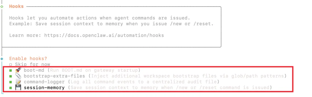 这一步是启动"Hooks"配置,点击空格键选中,支持多选。