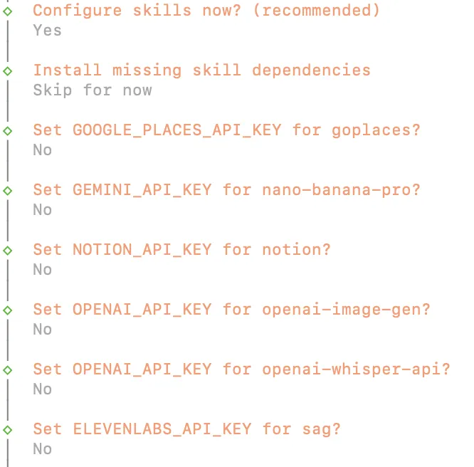 这些选项是为特定技能对接外部服务而设的,当前选择 No 表示暂不配置