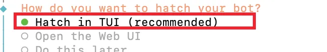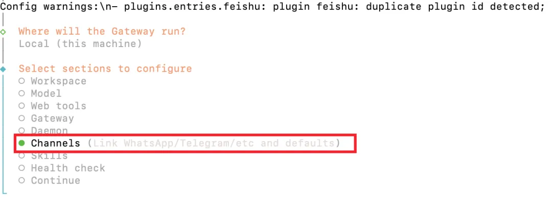 这一步是安装网关,安装完成后,配置机器人的交互方式,这里选择第一种
