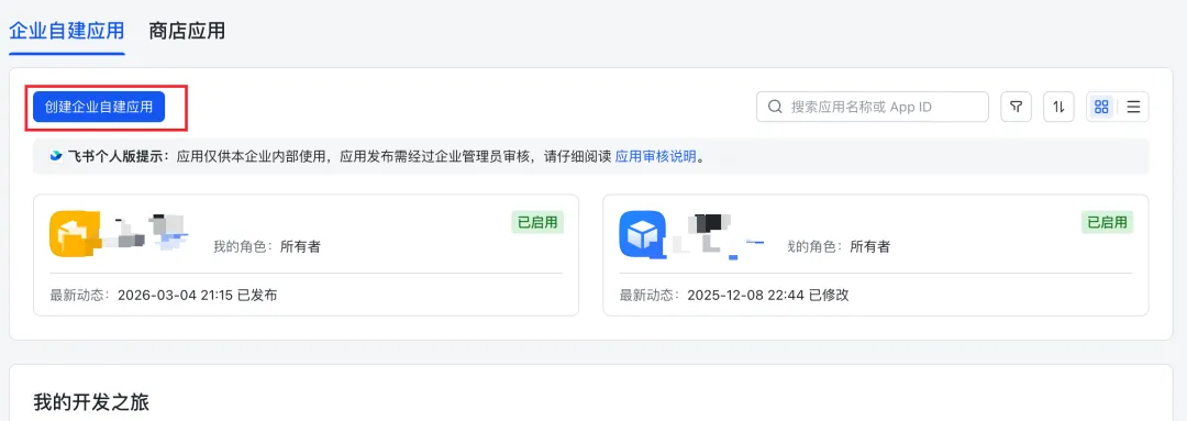 登录飞书开放平台 https://open.feishu.cn/app,创建一个企业自建应用