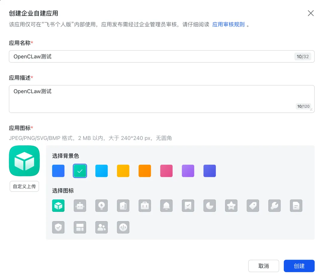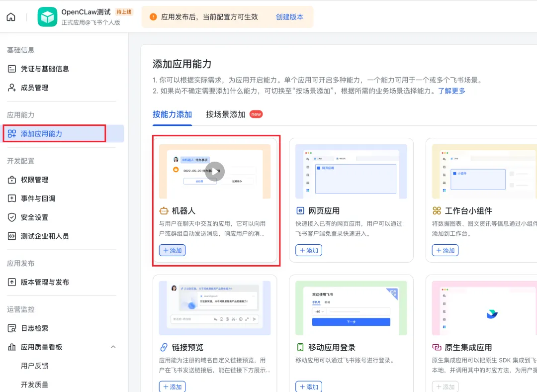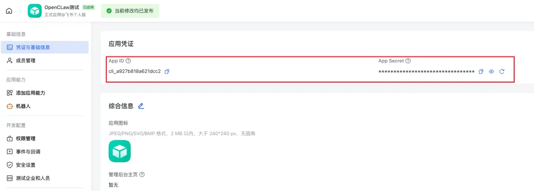 飞书应用创建完成,下一步需要将飞书的信息配置到OpenClaw上,这样才能使用刚才创建的“OpenClaw测试”应用,远程控制OpenClaw在电脑上进行操作