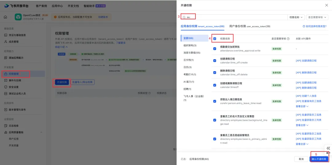 添加完机器人后,增加权限,搜索“im:”筛选出的权限全部选中,确认开通