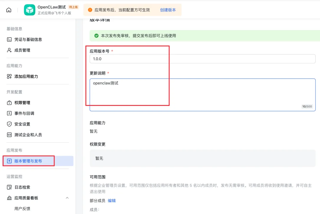 开通权限后,创建版本,填写版本号和描述,并发布应用
