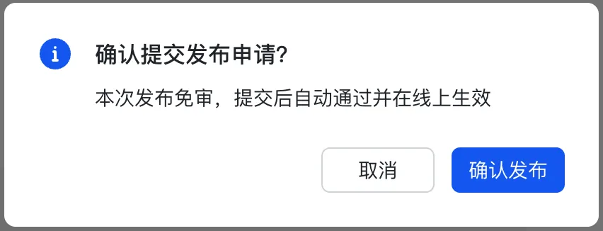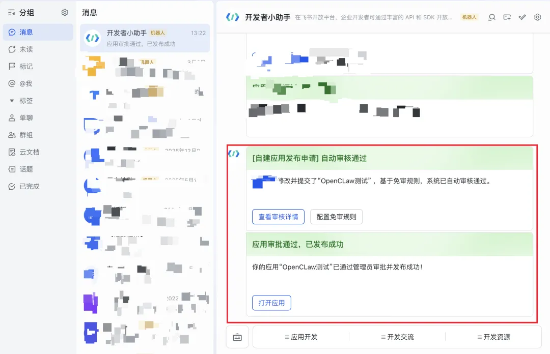 应用发布后,部分应用基于免审规则会自动审核通过,飞书APP会收到开发者小助手的“应用发布成功”的通知。