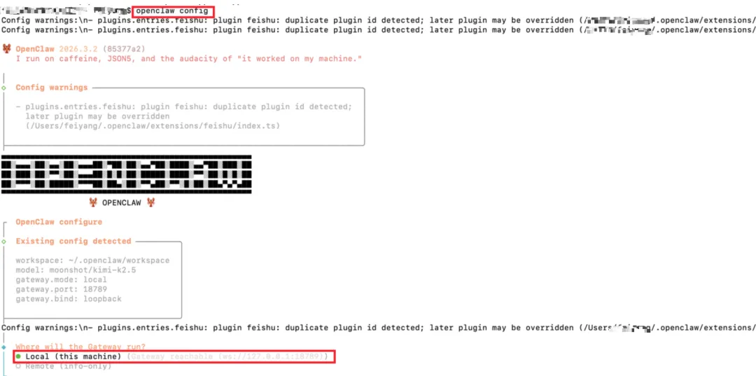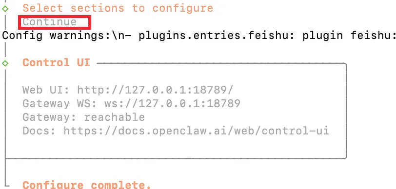 # 1.清理旧版飞书插件(否则后续会有冲突,首次执行命令需要输入电脑密码,输入密码不显示,直接回车)sudo rm -rf ~/.openclaw/extensions/feishu# 2.安装飞书插件openclaw plugins install @m1heng-clawd/feishu# 3.配置飞书插件openclaw config