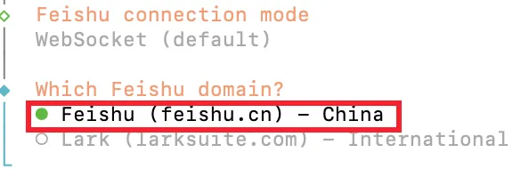 这里配置飞书连接方式,选择第一种“长连接”方式,由 OpenClaw 主动连接飞书网关,实时接收消息