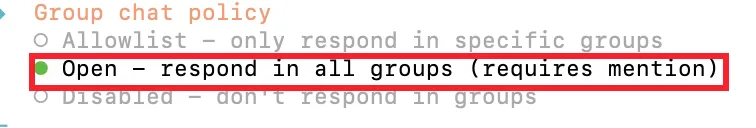 这是 OpenClaw 飞书插件的 ** 群聊策略(Group chat policy)** 配置,用来控制 AI 助手在飞书群聊中的响应行为,这里选择第一种,只能在制定白名单的群里响应,其他群里忽略