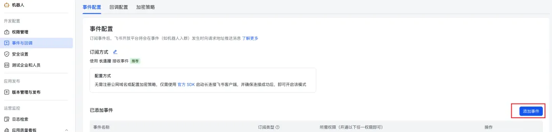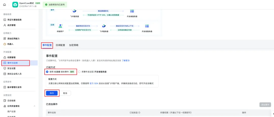 OpenClaw配置完成,让我们再返回飞书开放平台,选择「事件与回调」,选择“长连接”接收事件,并保存