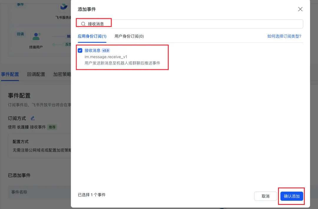 事件配置保存后,添加事件,搜索“接收消息”,选择并保存