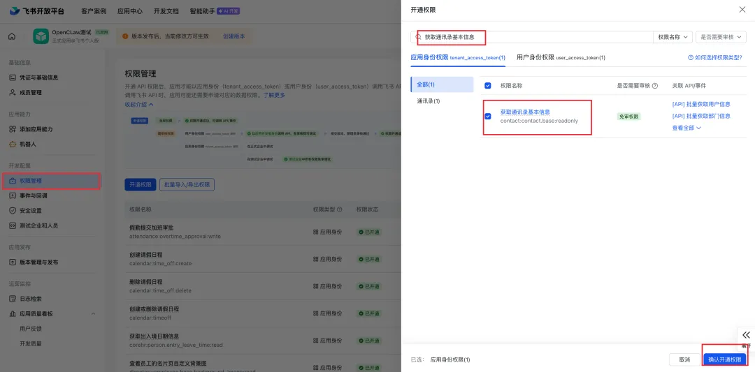 增加获取通讯录权限,搜索“获取通讯录基本信息”,点击并开通权限