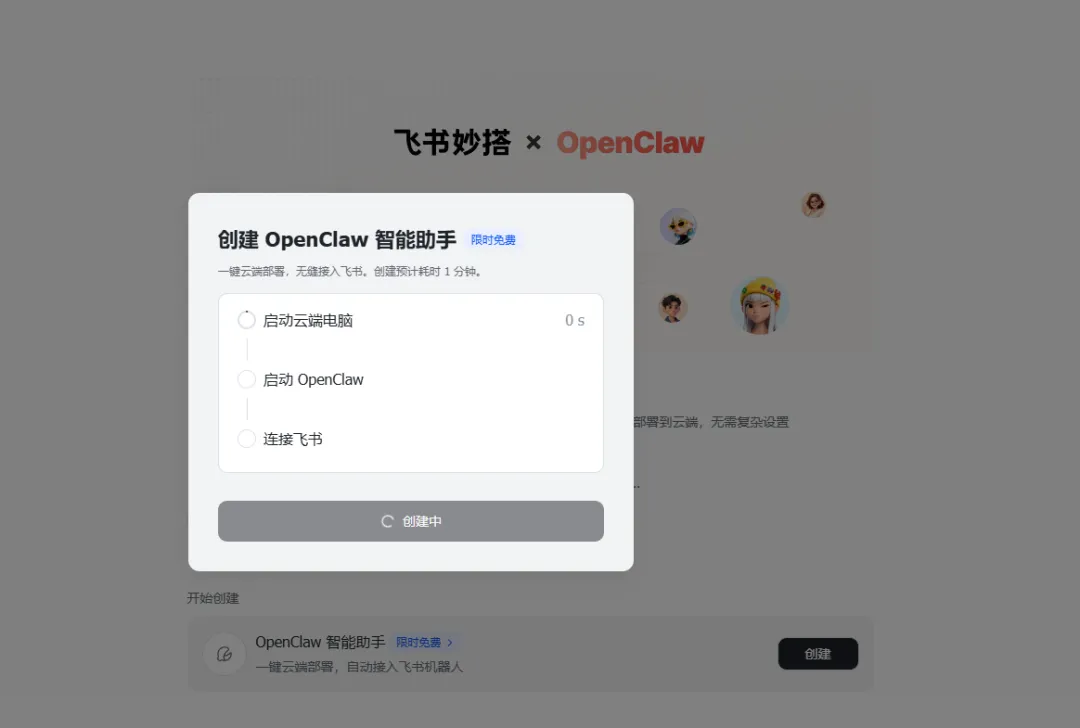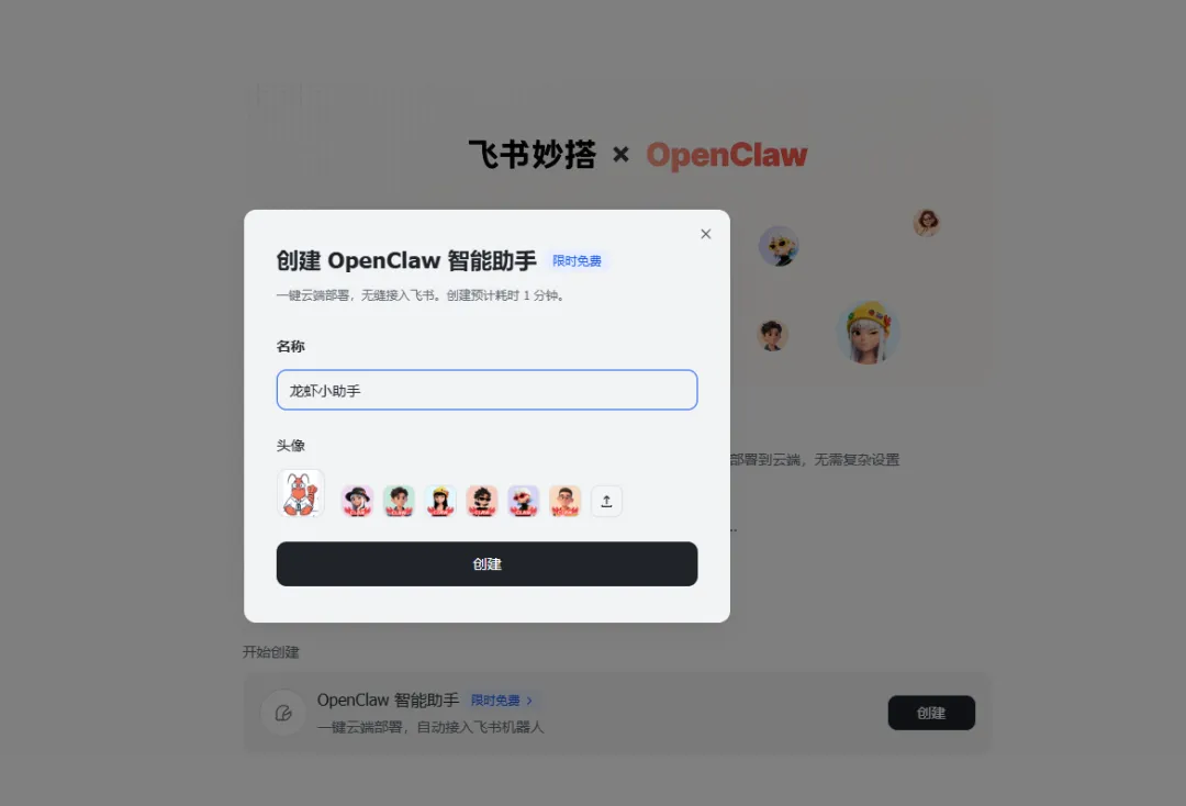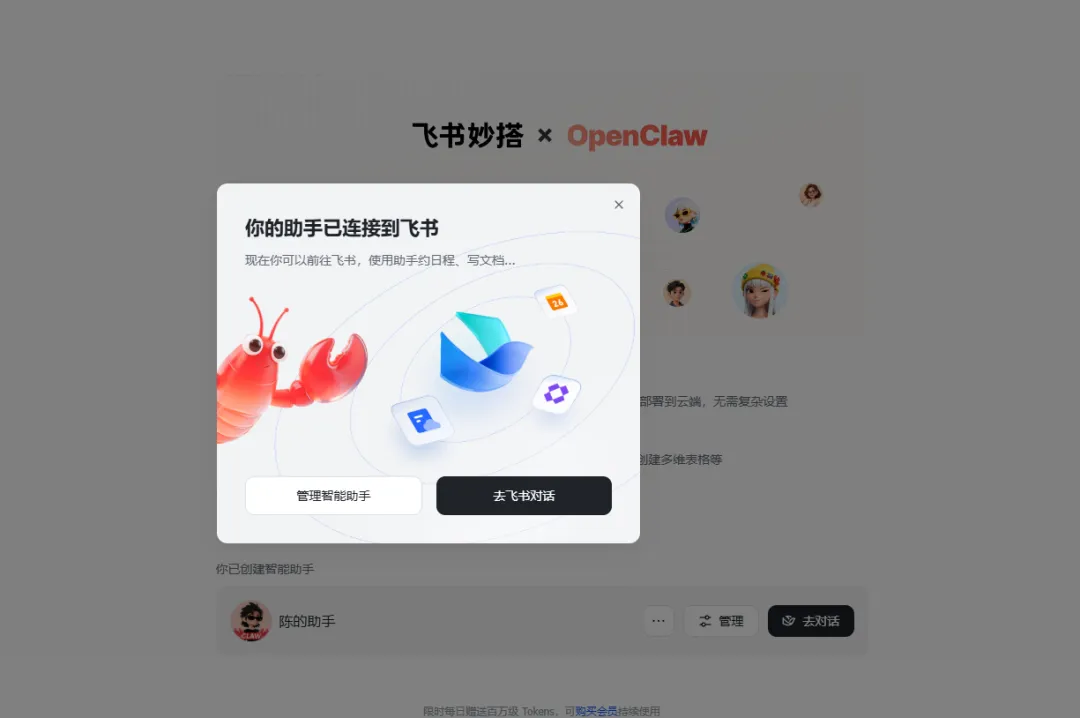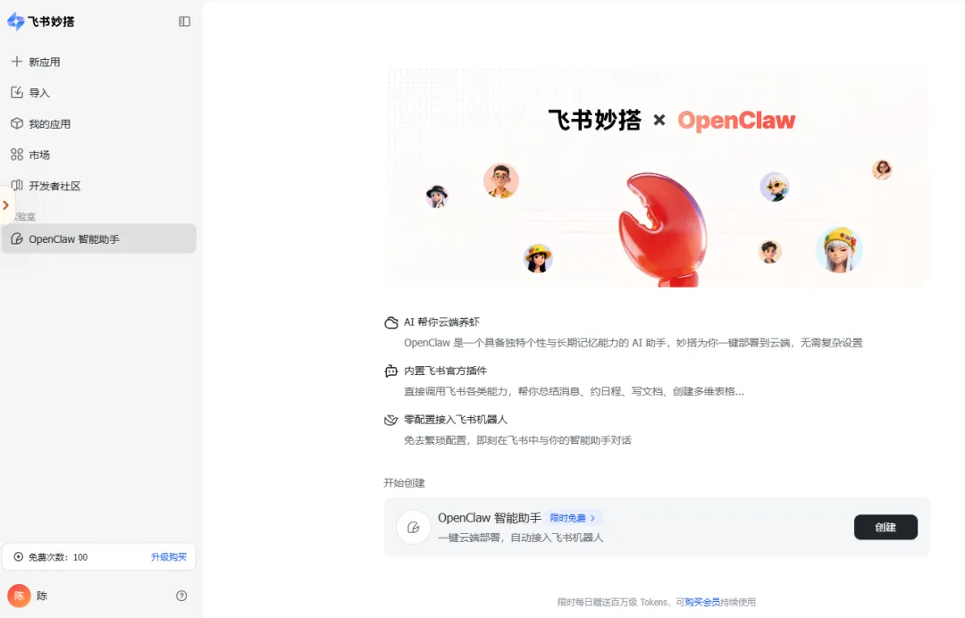 按照活动说明,每位用户目前限创建 1 个 OpenClaw 智能助手。创建完成后,系统会自动内置飞书插件,并自动绑定飞书机器人。也就是说,你不需要再单独做一堆接入动作,就能让这个助手去处理飞书文档、消息、日程等相关场景。