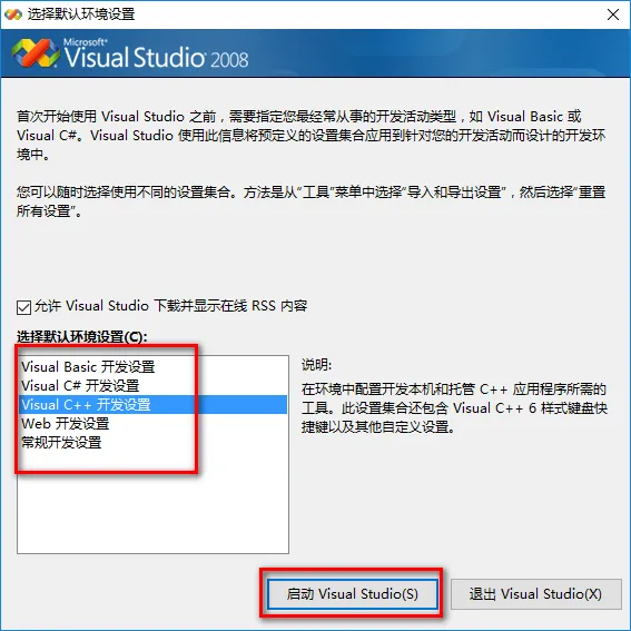 13.选择默认环境,然后点击“启动Visual Studio”