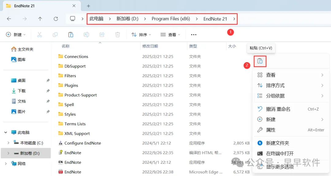 16、打开软件安装位置,步骤9可查看,路径为:D:\Program Files (x86)\ EndNote 21,再右键文件夹的空白处,点击【粘贴按钮】