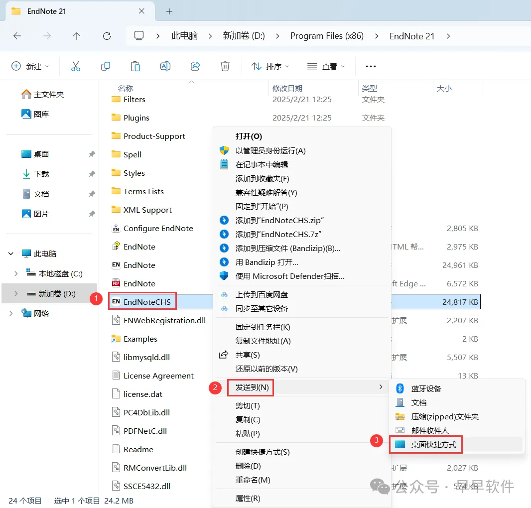 17、找到粘贴的【EndNoteCHS】文件,右键依次点击【显示更多选项】、【发送到】、【桌面快捷方式】,完成软件桌面快捷方式的创建