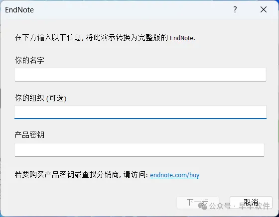 24、回到软件界面【你的名字】和【你的组织】随意填写英文,将复制的秘钥粘贴到【产品秘钥】处,再点击【下一步】