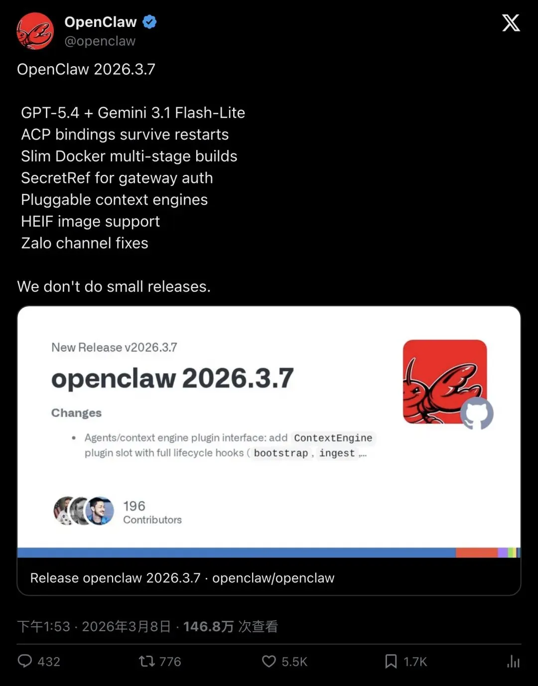 ▲ OpenClaw 2026.3.7版本发布公告,147万浏览