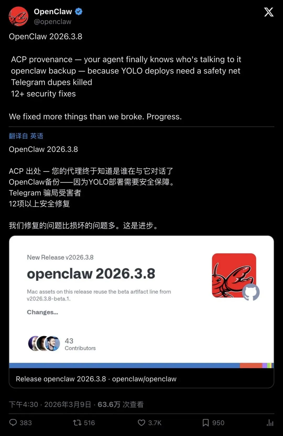 ▲ OpenClaw 2026.3.8版本发布公告,636万浏览,3699赞