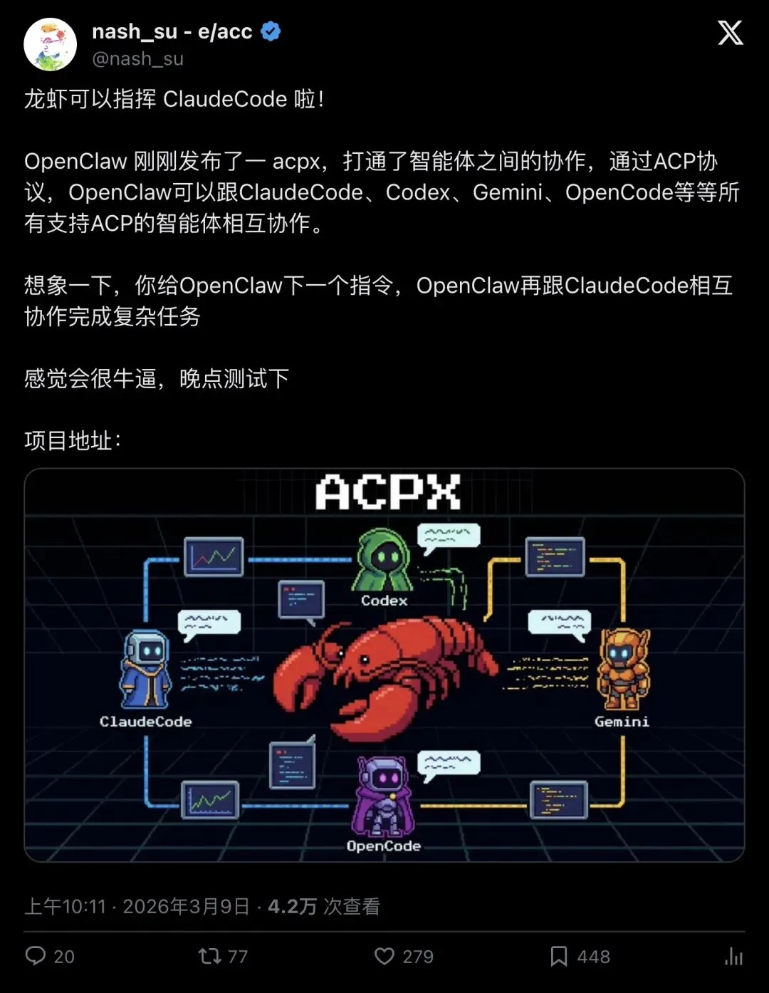 "OpenClaw 刚刚发布了一 acpx,打通了智能体之间的协作,通过ACP协议,OpenClaw可以跟ClaudeCode、Codex、Gemini、OpenCode等等所有支持ACP的智能体相互协作。想象一下,你给OpenClaw下一个指令,OpenClaw再跟ClaudeCode相互协作完成复杂任务。"