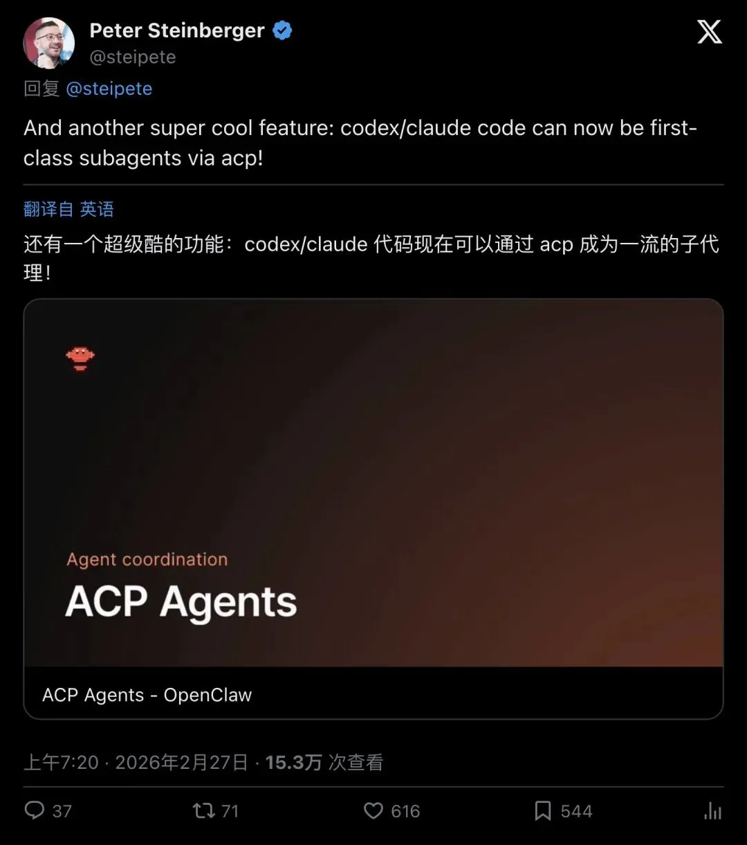 ▲ Peter Steinberger首次宣布ACP子代理功能,153万浏览