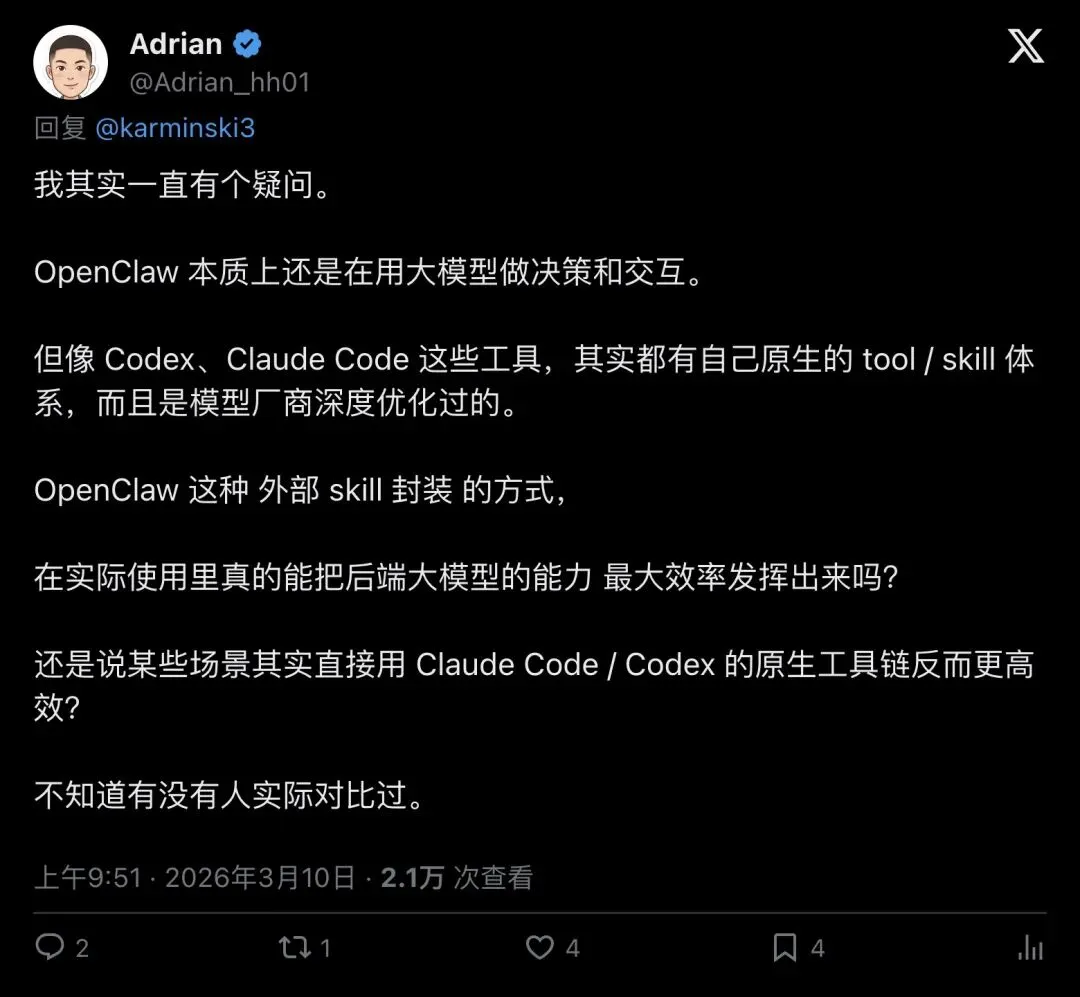 "OpenClaw 本质上还是在用大模型做决策和交互。但像 Codex、Claude Code 这些工具,其实都有自己原生的 tool / skill 体系,而且是模型厂商深度优化过的。OpenClaw 这种外部 skill 封装的方式,在实际使用里真的能把后端大模型的能力最大效率发挥出来吗?"