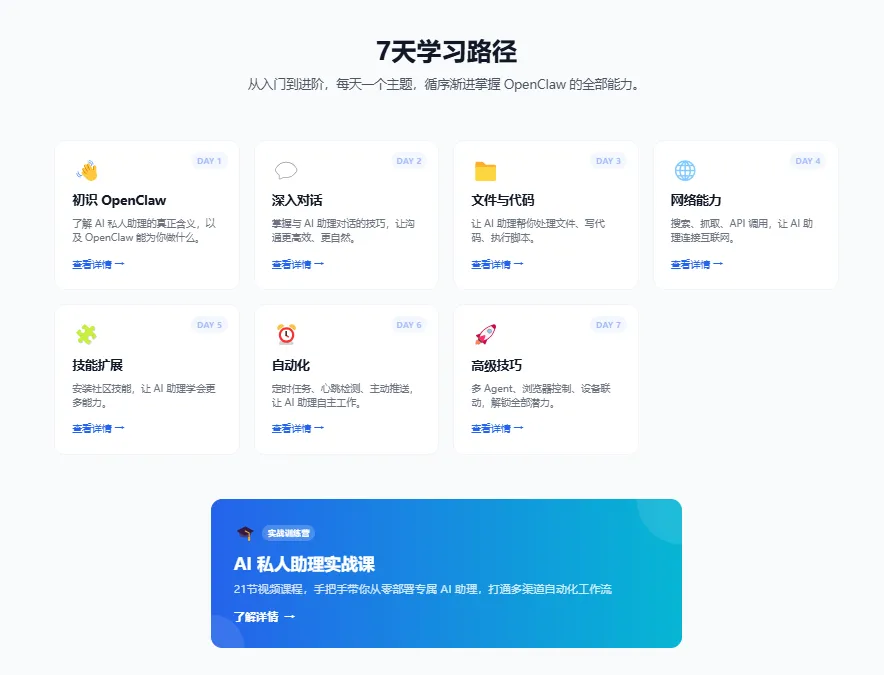 免费开源、7天系统学习路径(Day1认识 → Day7进阶)、精选教程(包括阿里云/腾讯云/B站/CSDN等)、5494+社区技能推荐、一键安装CLI、安全警告、飞书知识库版。社区评价:“一个网站就够,教程卖家集体失业”。GitHub: