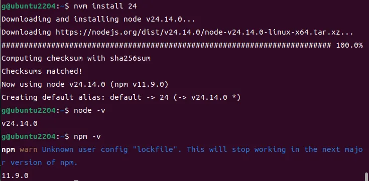 nvm install 24验证 Node.js 版本: